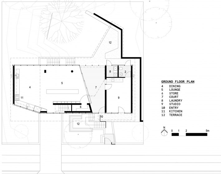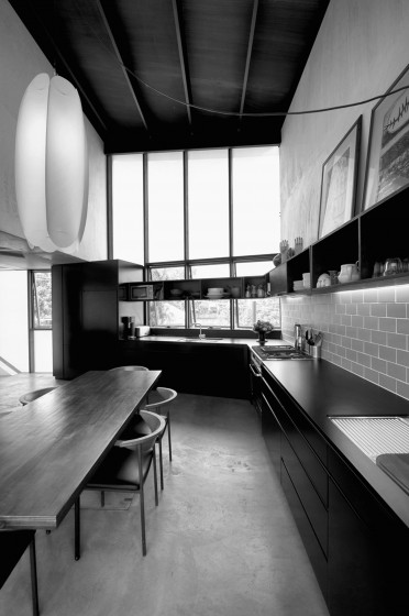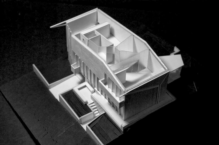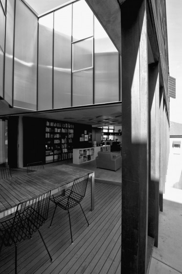 New house and studio with a central courtyard. Off form concrete structure and interiors, with timber cladding externally, and polycarbonate curtain walls.